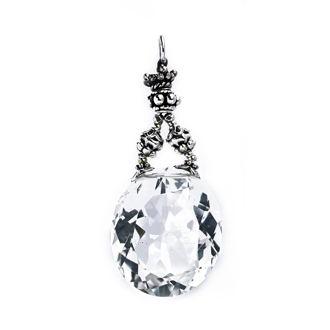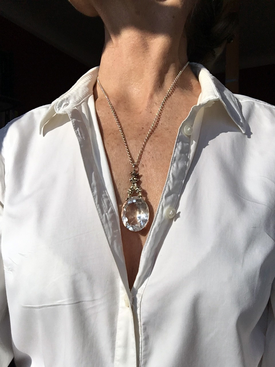 Man trägt diesen schönen Bergkristall mit der flachen Seite nach vorne.