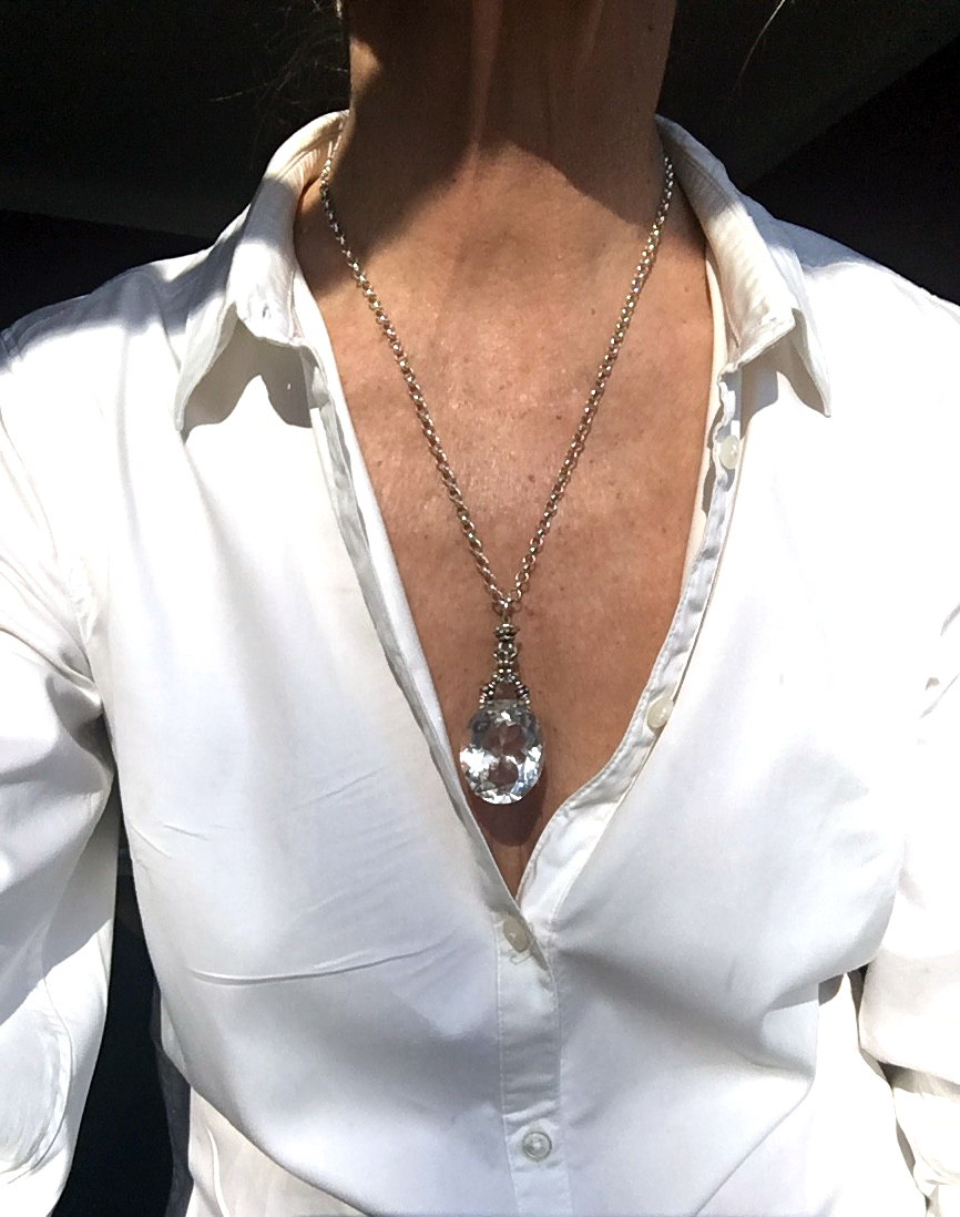 Man trägt diesen schönen Bergkristall mit der flachen Seite nach vorne.