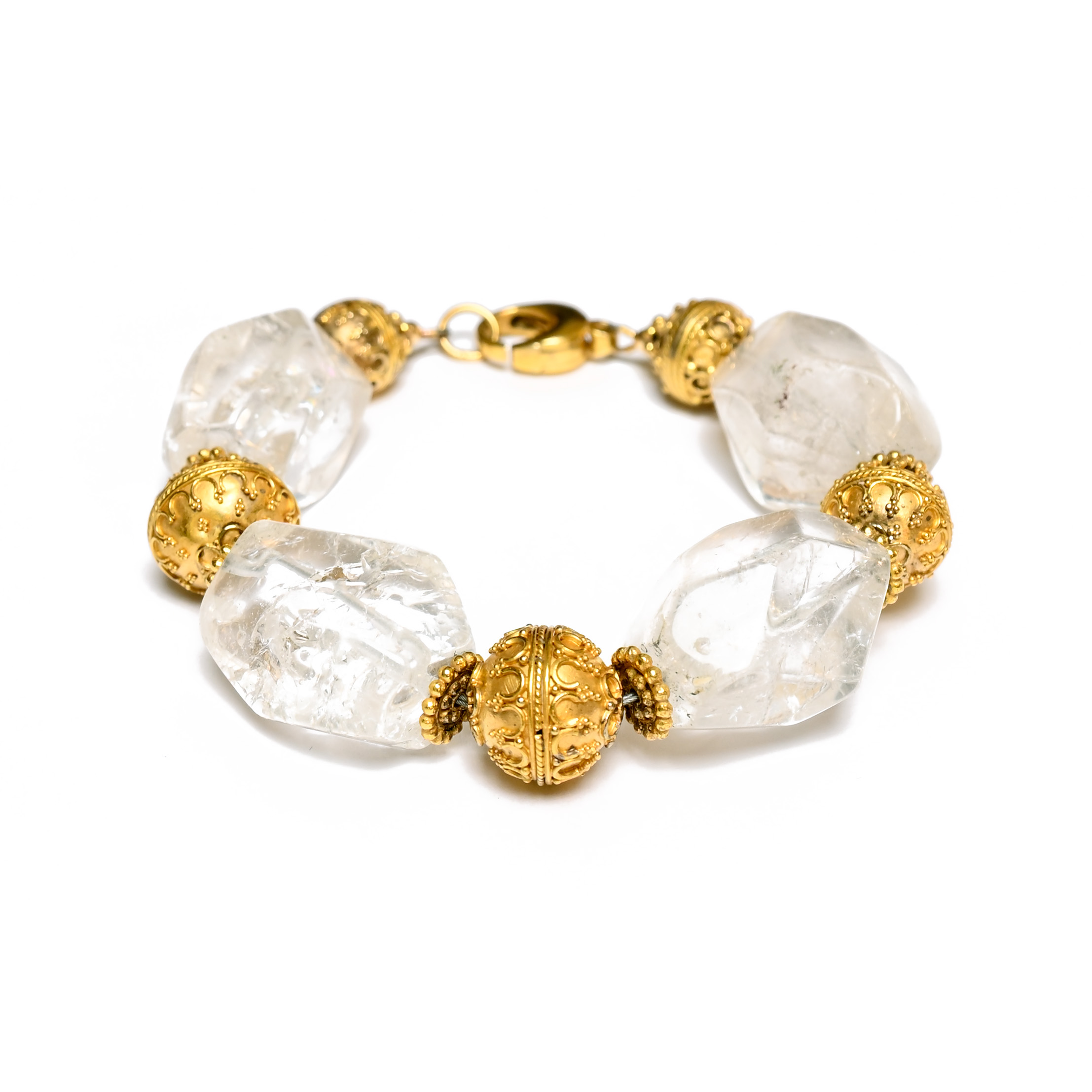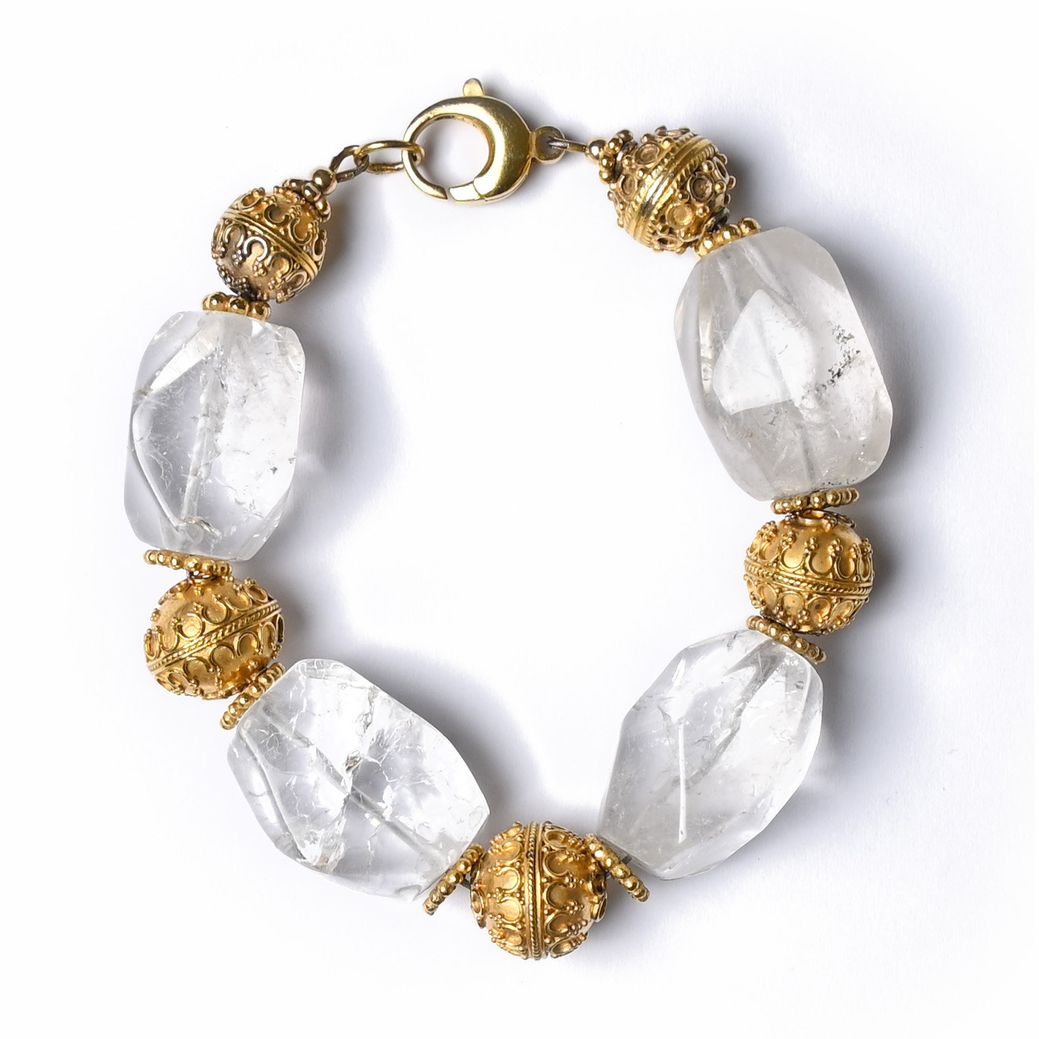 Ein wirklich wunderschönes Bergkristallarmband mit wunderbar leuchtenden Effekten und Lichtreflexen und mit herrlichen großen, goldenen, antiken und sehr fein gearbeiteten verzierten Kugeln.