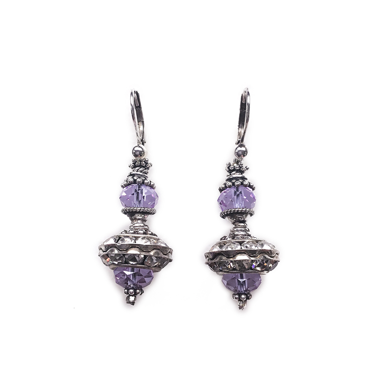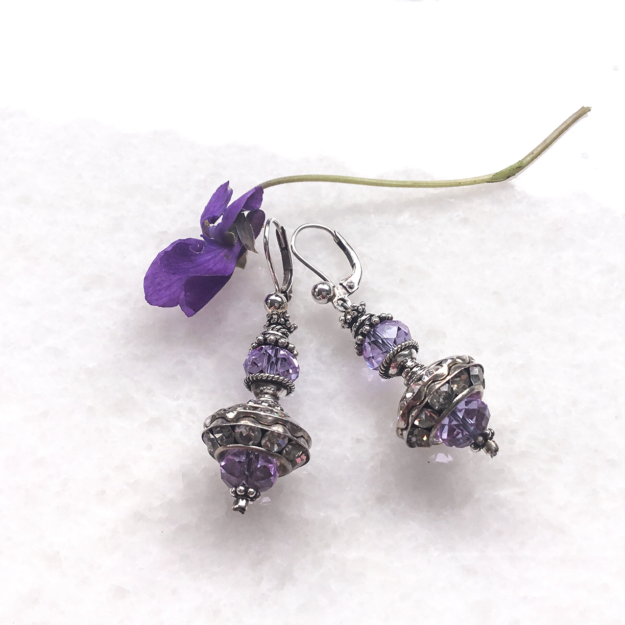 Material: Veilchenblaue Kristallsteine mit Strassrondellen und einer Aufhängung aus burmesischen antiken Sterlingsilberteilchen.